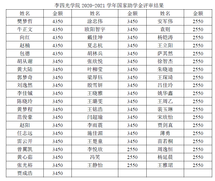 根据本科生院《关于开展2020-2021学年国家奖助学金评选工作的通知》要求,依据国家助学金评选办法,国家助学金金额每生每年在2000元至4600元范围内确定,不可分档超过4档,不可突破上下限额。本着“以学生为本,资助优先”的原则,综合学生贫困认定等级,学院奖助学金评审委员会将资助金额在原评定资助标准上进行了适当调整。特殊困难认定学生给予每人4350元资助,困难认定学生给予每人3450元资助,一般困难认定学生给予每人2550元资助。