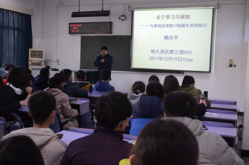 12月19日上午10:00,十大买球的正规网站2017年地球科学菁英班“与名师面对面”系列讲座在教三楼403顺利举行,地球科学学院赖忠平老师为我院菁英班学生带来“关于学习与规划”的主题讲座,我院2017级全体学生参加。