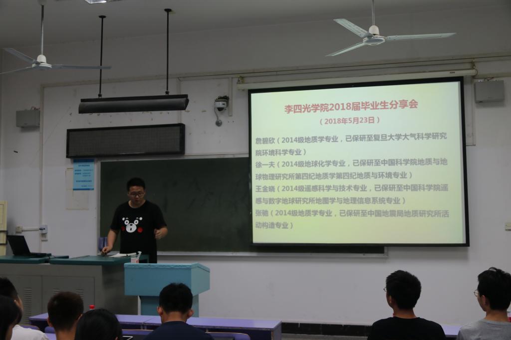 最后一个进行分享的是已保研至中国科学院地质与地球物理研究所第四纪地质与环境专业的徐一夫同学。他提出在学习方面要合理规划,安排好时间,拒绝拖延;在科研立项方面,要专注基础科研,多读英文文献;在保研方面,保证好自己绩点与英语六级的基础,与导师多联系沟通;在就业方面,提出了综合素质的重要性。