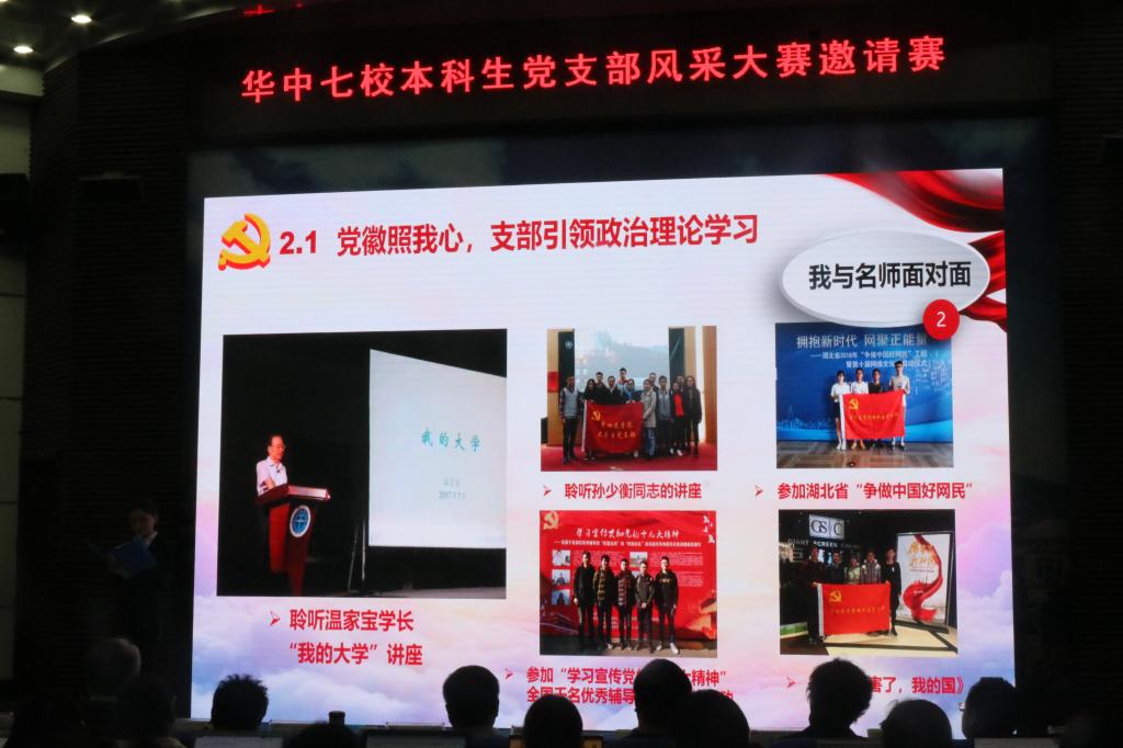 “以‘学习之路’主题教育为统领,深入推进‘党徽照我行’工程,通过支部引领政治理论学习、引领综合素质提高、引领追求学术卓越......”这是华中七校本科生党支部风采大赛的决赛现场,来自我院本科生党支部代表李慧玲同学的精彩陈述。