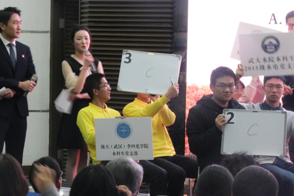 比赛分支部展示、理论问答与风采展演三个环节。在第一个环节,各支部代表结合PPT、短视频等形式对本支部党建特色活动和成果进行了展示,李慧玲同学从支部建设夯基础、特色活动重引领、展望未来明方向三个方面,介绍了我院本科生党支部引领全院学生在课堂内外学思践悟,争做新时代“品德高尚、基础厚实、专业精深、知行合一”地质人、努力将支部打造成学习型、服务型、创新型党支部的奋斗旅程。在第二个环节,针对党章党史、党规党纪、十九大报告等党的基本知识和时政热点,各参赛队伍进行了大比拼,充分展示了支部成员在“两学一做”活动和学习十九大精神中的学习成效与实践成果。在第三个环节,可谓精彩纷呈,各支部通过舞台剧、演唱、朗诵等现场舞台表演方式展示各自风采,我院本科生党支部通过原创诗朗诵《我永远不会忘记》,展现了支部党员不忘入党初心,牢记党员使命,在学习生活中践行十九大精神,争做有为青年的故事。朗诵最后,支部成员合唱《我宣誓》,充沛的激情、嘹亮的歌声极大地调动了现场氛围,赢得了观众们的青睐和评委们的一致好评。