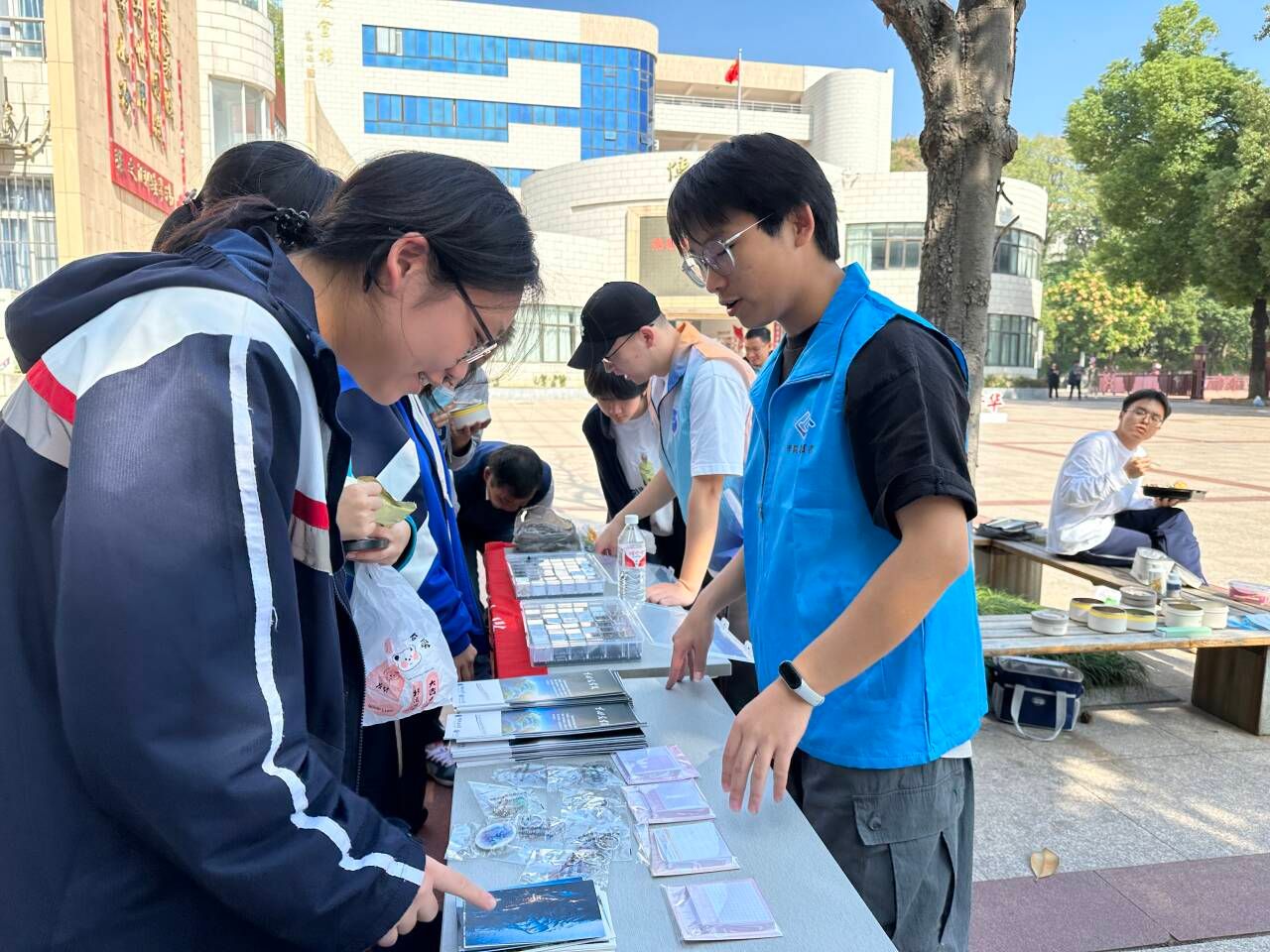 为了加深学生们对李四光精神的理解和记忆,志愿者们精心策划了一系列互动问答环节,并向每位学生赠送了纪念性小礼品。这些活动不仅吸引了大量学生的热情参与,还引导他们通过阅读展板上的内容,寻找答案,从而获得知识。学生们踊跃参与,认真回答问题,这不仅加深了他们对李四光先生生平事迹的理解,而且深受其精神的感染。