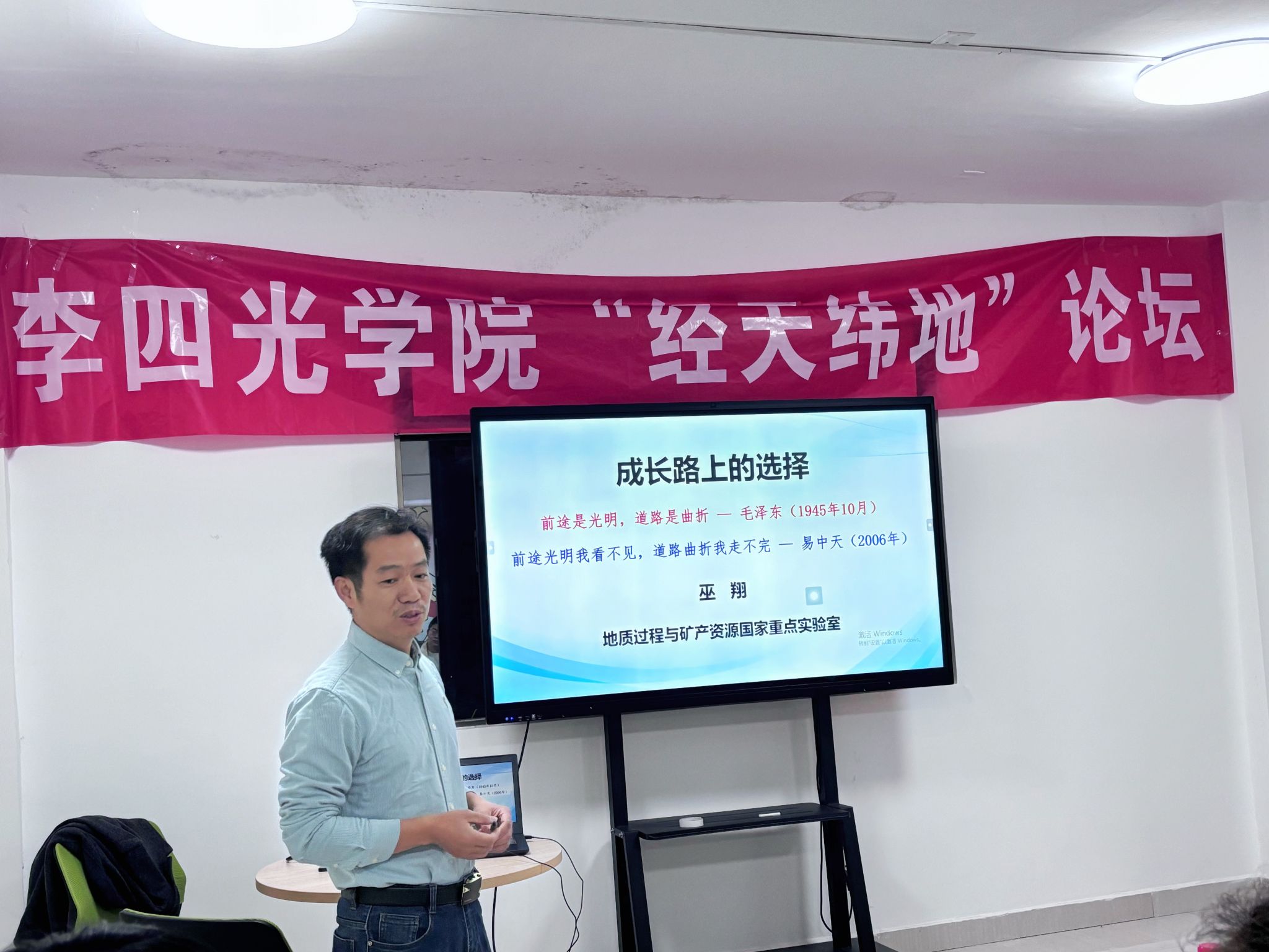 随后,巫翔教授深入分享了自己在物理学、地质学等领域的研究心得,并寄语在场的同学,希望大家能成长为学术界的顶尖人才。他还指出,生活在团结互助的集体中,个人的潜力才能得到更好地发挥。在谈到人生选择时,巫教授强调,个人选择虽受时代环境的影响,但只要坚持不懈地努力,终将有所收获。