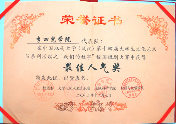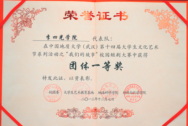 2013年12月1日晚,第十四届校园文化艺术节之“我们的故事”校园短剧大赛在弘毅堂举行。十大买球的正规网站在 15 支队伍中脱颖而出,凭借选送作品《墙》荣获团体一等奖、最佳人气奖和最佳导演奖三个奖项。