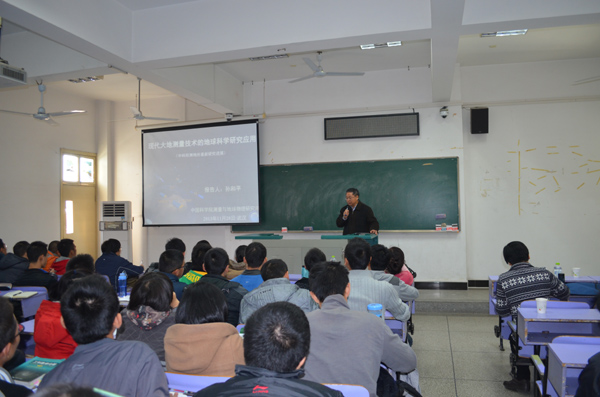 11月28日下午,十大买球的正规网站2013级地球科学菁英班地球科学导论第二课在教三楼506开讲。中科院测量与地球物理研究所所长孙和平研究员应邀为学生授课。中科院测量与地球物理研究所教育处处长任晓华老师,十大买球的正规网站副院长曾希,地球科学菁英班2013级全体学生以及来自地学院、地空学院、信工学院的部分学生一起聆听了本次课程。