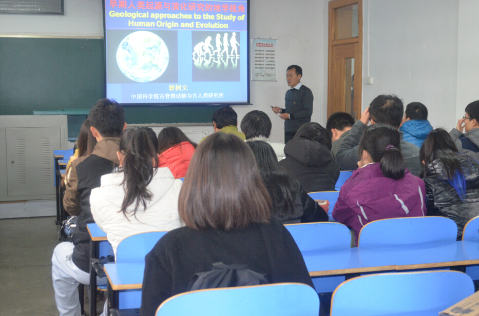 11月27日下午14:00,十大买球的正规网站2015-2016学年地球科学菁英班“与中科院名师面对面”系列讲座第二讲在教一206顺利举行,中国科学院古脊椎与古人类研究所裴树文老师为我院菁英班学生带来“早期人类起源与演化研究的地学视角”的专题讲座。